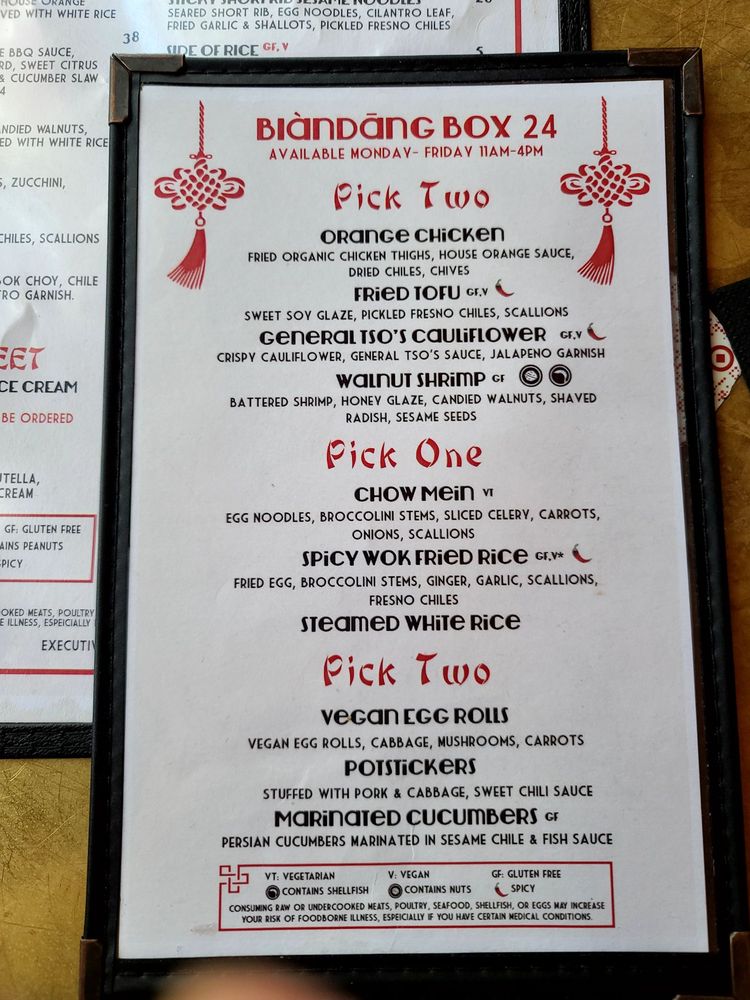 BIandang Box - Available Monday- Friday pm-pmPick Two:-Orange chicken-Fried Tofu GF, V-General Tsos Cauliflower GF,V-Walnut shrimp GFPick One:-Chow Mein VT-Spicy Wok Fried Rice GF, V-Steamed White ricePick Two:-Vegan Egg Rolls-Potstickers-Marinated Cucumbers GF